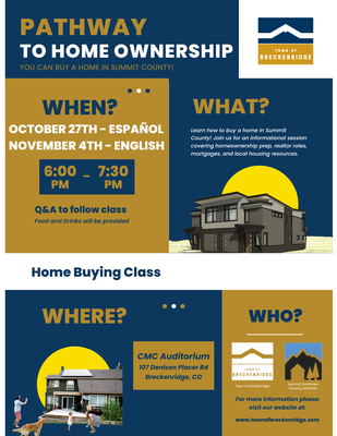 The Town of Breckenridge and the Summit County Housing Authority (SCHA) are hosting two upcoming public sessions to introduce local residents to the homebuying process for workforce housing. These sessions present an overview of how to become a homeowner in Summit County by demystifying the process, explaining workforce housing options and providing concrete guidance and resources on where to begin.
